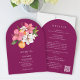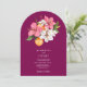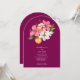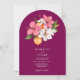 Announce your upcoming nuptials with this eye-catching arch-shaped wedding invitation. The striking design showcases a lively arrangement of pink flowers, delicate white blooms, and bright oranges, symbolising the sweetness of your love. Set against a rich plum backdrop, this invitation exudes a modern yet whimsical charm. The text is easily readable, allowing for clear presentation of your wedding date, time, and venue. This invitation is a beautiful choice for couples who want to add a splash of colour and personality to their wedding stationery.