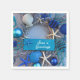Add these stunning coastal-inspired paper napkins to your tropical-themed holiday celebrations. The photo image on the paper cocktail napkins feature starfish, striped fish, seahorse, clam shells, coral, and ornamental balls in various shades of silver, blue, and white. The plaque reads "Seas 'n Greetings." The paper napkins are available in white or ecru background, and sold in quantities of 50. Photography by Glenda Motsavage, a Florida-based travel writer and author. Image from Orlando Museum of Art, Festival of Trees.