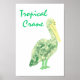 Mosaic, graphic drawing, of a Tropical Crane, bird, displayed in, exotic, island patterns of; ecru, yellow, green, olive-green, lime, taupe, and black.