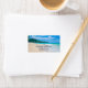 Address labels with a photograph of a gorgeous vacation location. Bright blue sky, soft sandy beach with tropical crystal clear blue waters. A lush tree covered mountain in the background. Scenic and tranquil photography.