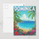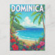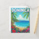 Celebrate the natural beauty of the Caribbean's "Nature Isle" with this vibrant, stylized travel postcard for Dominica. The illustration captures a secluded, lush beach with crystal-clear blue water, golden sand, and towering palm trees. The foreground explodes with colorful tropical flowers like hibiscus. The bold lettering declares "DOMINICA" at the top. This card is perfect for those who love the Caribbean, nature, diving, or collecting retro and colorful travel art.