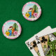 Poker chips with tropical design. Frosty cocktails, hibiscus flowers and big leaves are the design on chips with edge color options.