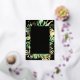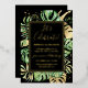 This elegant tropical elopement wedding celebration invitation features green and gold palm, philodendron, and fern leaves on a black background. An elegant gold foil frame highlights the gold foil text. Gold foil splatters accentuate this exotic botanical design and brings a bit of modern whimsy to the invitation. "Let's Celebrate!" along with the newlyweds' names are featured at the top. The wedding vow details and reception details are underneath. RSVP information is on the back of the invitation.