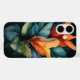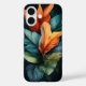 Bold, stylised orange and yellow blossoms with deep green accents on a dark background evoke a tropical paradise ignited by sunset hues.