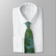 The artwork on this Neck Tie is an original photograph from nature. The photo of deep green tropical leaves and tree trunks, with a turquoise blue sky background, fans out across the tie, with an antique green tint over it, giving it a look of old silk fabric.