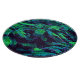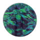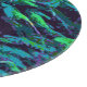 The original abstract fabric pattern by HomeWare on this round Cutting Board was created from an original photograph of a royal poinciana tree. Some of the tree's tropical leaves are in sunlight, in bright yellow greens. Others are in shadow, in shades of blue from aqua to deep teal, with purple highlights. The background is almost black. The design has an overall fabric texture.