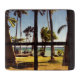 Tropical Fiji Beach Scene - Photograph of a beach in the Fiji Islands with palm trees, hammocks and a picnic bench seen through the open shutters of a beach hut.