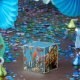 It's party time under the sea. Busy and chaotic underwater scene of tropical black and white striped fish mixing it up with the goldfish.