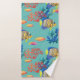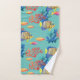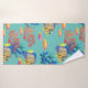 Stunning towel set features colorful tropical coral and fish watercolor pattern on aqua background.