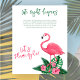 Baby shower invitation design features pink flamingo with lush green palm leaf fronds and tropical hibiscus flowers. "Aloha Baby". A tropical floral pattern with black background color dresses up the back of the card. Let's Flamingle!