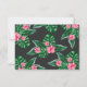 Baby shower invitation design features pink flamingo with lush green palm leaf fronds and tropical hibiscus flowers. "Aloha Baby". A tropical floral pattern with black background colour dresses up the back of the card.
