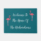 Welcome guests to your home with these colourful family monogram home welcome doormats designed with two tropical pink flamingos and stylish text design with family name template you can replace with your own family name.