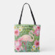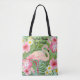 Gather the crew for a tropical getaway with this eye-catching tote featuring a pink flamingo surrounded by lush hibiscus, plumeria, and palm fronds in a vibrant allover pattern. A personalized location and event name in playful script make it a one-of-a-kind souvenir for a girls weekend, bachelorette trip, or beach vacation. Location and event text are fully customizable.