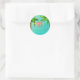 A sticker design with a tropical theme features flip flops on clothesline hanging between two palm trees on blue background. Coordinating items available. Some graphics by freepik.com