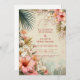 Celebrate your wedding day with timeless tropical elegance. This romantic design features lush hibiscus blooms, soft palm leaves, and painterly botanical details layered over a warm, vintage-inspired background. The refined typography and airy island palette create a sophisticated destination wedding feel that’s perfect for coastal venues, tropical resorts, or summer celebrations.