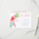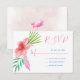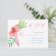Colourful modern beach wedding invitation rsvp card with fully editable typography script featuring a coral pink hibiscus flower with tropical leaves bouquet. Perfect choice for a modern summer luau, aloha beach, sea, oceanfront, coastal, tropical, nautical or destination themed wedding.