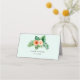 Beautiful wedding place card design featuring watercolor flowers and foliage on a white background in the front and mint green background at the back.
