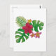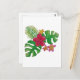 A watercolour pencil drawing of a tropical pink flower with green leaves.
