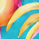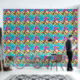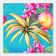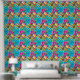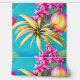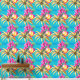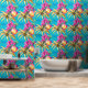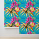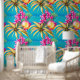 Ideal for any beachy establishment; coastal restaurant; hotel; lodge; resort and chalet, this seamless repeating pattern features tropical leaves above which pink flowers and a round island fruit appear set against a vibrant turquoise blue background. Bring the beach indoors, with this elegant and trendy Hawaiian inspired easy to peel and stick wall mural that is ideal for both smooth and textured walls.