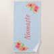 Pretty yoga themed beach towel done in light blue, with graphics of colourful tropical flowers. Coral coloured text reads Namaste and can be personalised to read what you want.