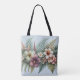 Imagine a tote bag perfect for errand runs, decorated with Hawaiian-style tropical foliage featuring an arched window with hibiscus flowers and ferns adorning it. Gentle shades of earth tone colours complemented by a range of ferns and foliage. The back side has a different view of similar floral greenery.