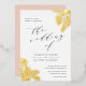 Invite guests to your summer, destination or beach wedding with these tropical chic wedding invitations featuring tropical palm frond leaves in elegant gold foil. Your wedding details appear in a mix of calligraphy script, serif, and italic typography. Cards reverse to solid blush pink for a chic tropical look.
