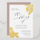 Invite guests to your summer, destination or beach wedding with these tropical chic wedding invitations featuring tropical palm frond leaves in elegant gold foil. Your wedding details appear in a mix of calligraphy script, serif, and italic typography. Cards reverse to solid earth tone rosy taupe pink for a chic tropical look.