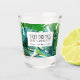 Tropical wedding keepsake favours for your beach wedding guests. Shot glasses featuring a tropical pattern with black text design that reads - Free drinks (and a wedding!). Customise with your names and wedding date.