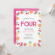 Have a tropical 4th (fouth) birthday party for your little one! This adorable fruity pink birthday invitation features a watercolour fruits including pineapples, watermelons, oranges, cherries and strawberries. All details including (except for age) is customizable. Other ages also available in this collection.