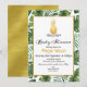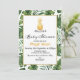 Looking for a gender neutral tropical baby shower invitation? This design may be right for you. It features a faux gold pineapple some green foliage and an rectangle white frame with a faux gold line border. The background is white. The back of the invitation is a faux gold texture image. This mostly green and gold tropical or foliage baby shower invitation is ready to be personalized and is suitable for a gender neutral baby shower. More designs in this theme are available at the store.