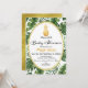 Looking for a gender neutral tropical baby shower invitation? This design may be right for you. It features a faux gold pineapple some green foliage and an oval white frame with a faux gold line border. The background is white. The back of the invitation is a faux gold texture image. This mostly green and gold tropical or foliage baby shower invitation is ready to be personalised and is suitable for a gender neutral baby shower. More designs in this theme are available at the store.