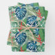 Wrapping paper features tropical flowers, green palm tree and blue monstera leaves on white, yellow and grey backgrounds. MATCHING items in our store.