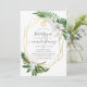 Tropical leaves and white magnolias bat mitzvah invite with gold geometric frame and elegant handwriting typography.