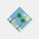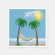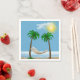 pair of tropical palm trees on beach sand with ocean view and hammock in sunshine