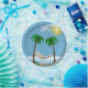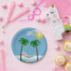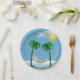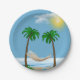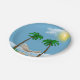 pair of tropical palm trees on beach sand with ocean view and hammock in sunshine