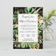 This elegant tropical elopement reception invitation features green and gold palm, philodendron, and fern leaves on a black background. An elegant gold frame highlights the black text. Gold splatters accentuate this exotic botanical design and brings a bit of modern whimsy to the invitation. "Happily Ever After Celebration" along with the bride and groom's names are featured at the top. Wedding vow details and reception location and date are detailed underneath. RSVP information is on the back of the invitation.