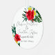 This custom ornament features a tropical beach or island wedding theme. The background is a simple and elegant white with colourful, tropical Hawaiian flowers. Floral bouquets with palm leaves, hibiscus, and frangipani flowers accent the borders.