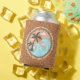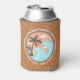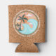 Simple classic beachy looking beverage can cooler with fun colourful retro Illustration image of green palm trees, blue waves, orange sun, and yellow and pink sunrays. Surrounded by words related to summertime... Waves, Beach Parties, Good Vibes, Cocktails, Summer, Friends, Laughter, Sun, and Surf. Cool cups for use during bbq beach or backyard parties and to have in stock at your patio or poolside tiki bar.