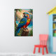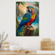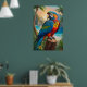 The vibrant tropical Hawaiin macaw poses on a wooden stump with a tropical paradise background. Beautiful bird with yellow, blue, red, green, and orange colours. This tropical setting includes palm trees, islands, beaches, tropical water waves and plants of the tropics.