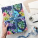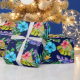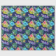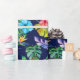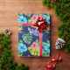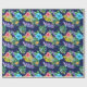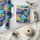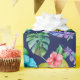 A gorgeous, colourful tropical wrapping paper similar to Hawaiian patterns. It features large, lush flowers and tropical leaves in green, purple and blue, highlighted by pretty hibiscus flowers in blue and pink.