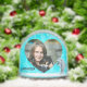 Christmas snow globe with two heart-shaped photo templates. Customise each side with a photo and name. Side one has a dolphin image and side two has a palm tree. The background is an aqua blue graphic design. Names are printed in a fun, uppercase font and have a white shadow. This snow globe makes for a perfect gift to the grandparents.