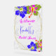 Tropical bridal shower welcome sign in opaque acrylic. Size 12 x 18 inches with a floral border. Illustrated hibiscus flowers decorate the top and bottom corner. Gold coloured lines frame the wording. The floral border will not work on larger signs, but you may go smaller.
