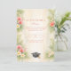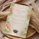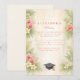 A soft parchment backdrop is framed by lush tropical greenery and coral hibiscus blooms, creating a fresh yet elegant celebration aesthetic. Delicate plumeria accents and airy palm leaves bring a warm, destination-inspired feel, while the classic typography keeps the layout refined and timeless. A subtle graduation cap detail grounds the design with just the right academic touch.