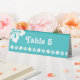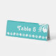 This tropical-themed table tent sign features a bright turquoise background with a stripe of white hibiscus flower and tropical leaf silhouettes decorating it along the bottom and a single hibiscus in the upper corner. Plenty of space is left above the bottom band so you can fill in the table number or other information, so that seating can go more smoothly at your summer wedding. Be sure to check out the full Tropical Hibiscus in Turquoise collection to find more products, including invitations, guest books, napkins, and even favour boxes, with matching designs that will allow for a truly coordinated wedding or special event.