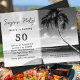 Sepia tone beach scene surprise party invitation to his milestone celebration. A wooden boat sits on a deserted beach with palm trees, ocean waves and sky as the background for your custom wording. Use the surprise party title, or change it to "Birthday Party" or whatever. Age is in big numbers and name template can accommodate first or full name. Include rsvp and other info to the right of the main text. Reverse is dark sepia brown.