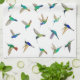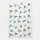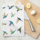 Unique colourful kitchen towel for hummingbird lovers featuring several species of tropical hummingbirds, such as a Fiery-throated Hummingbirds, Golden-tailed Sapphire and Sapphire-bellied Hummingbirds, Violetear, Coronet and Glittering Starfrontlet Hummingbirds. Images taken from original watercolor paintings by Christiane Dobbins.