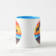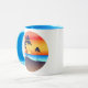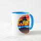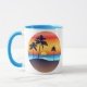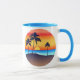 Coffee mug in an image of a tropical island with palm trees, against an orange sunset and turquoise ocean