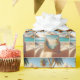 A sandy beach features an open envelope revealing a framed scene of a tropical island