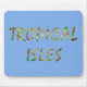 Mosaic, graphic text, "Tropical Isles" which signifies, a fictitious, fantasy place-displayed in an exotic, island pattern of; orange, olive-green, yellow, taupe, brown, black, and white.