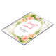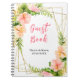 This beautiful and elegant wedding guest book features watercolor pink and orange hibiscus flowers and foliage on a gold geometric frame. The text combines handwritten script and serif fonts for a stylish and modern look. This is perfect for a summer tropical wedding.